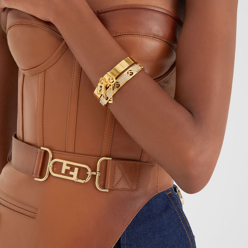 stivt armbånd med f er fendi-motiv. smekklås. laget av metall med gullfinish. pyntet med små hvite krystaller.