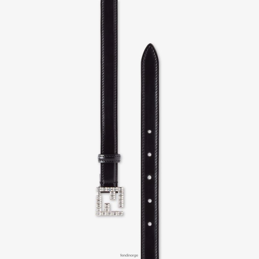 tynt belte med hempe og ikonisk ff stiftspenne. laget av svart skinn. spenne dekorert med krystaller. metallvare med palladium-finish.
