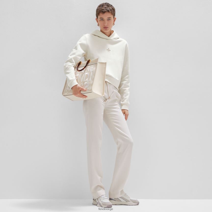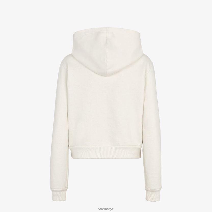 vendbar cropped sweatshirt med hette. ribbestrikket krage, mansjetter og fald. laget av bomullsjersey med den ene siden i ensfarget kremhvit farge og den andre med ff-motivet i samme tone. den ensfargede siden er tilpasset med en liten fendi roma-logo trykket i midten foran.