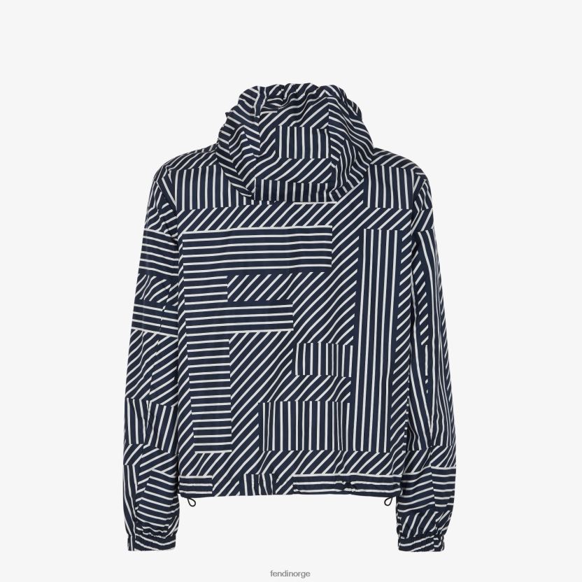 vendbar vindjakke med hette med snøring. sidelommer. stretch mansjetter og fald. glidelås med dobbel glider. laget av blått teknisk stoff. panseret er tilpasset med et trykt fendi-skyggemotiv i en makroversjon på den ene siden og en mikroversjon på den andre.