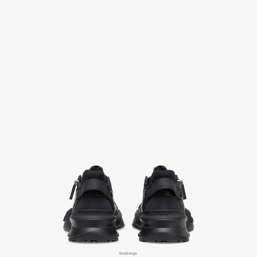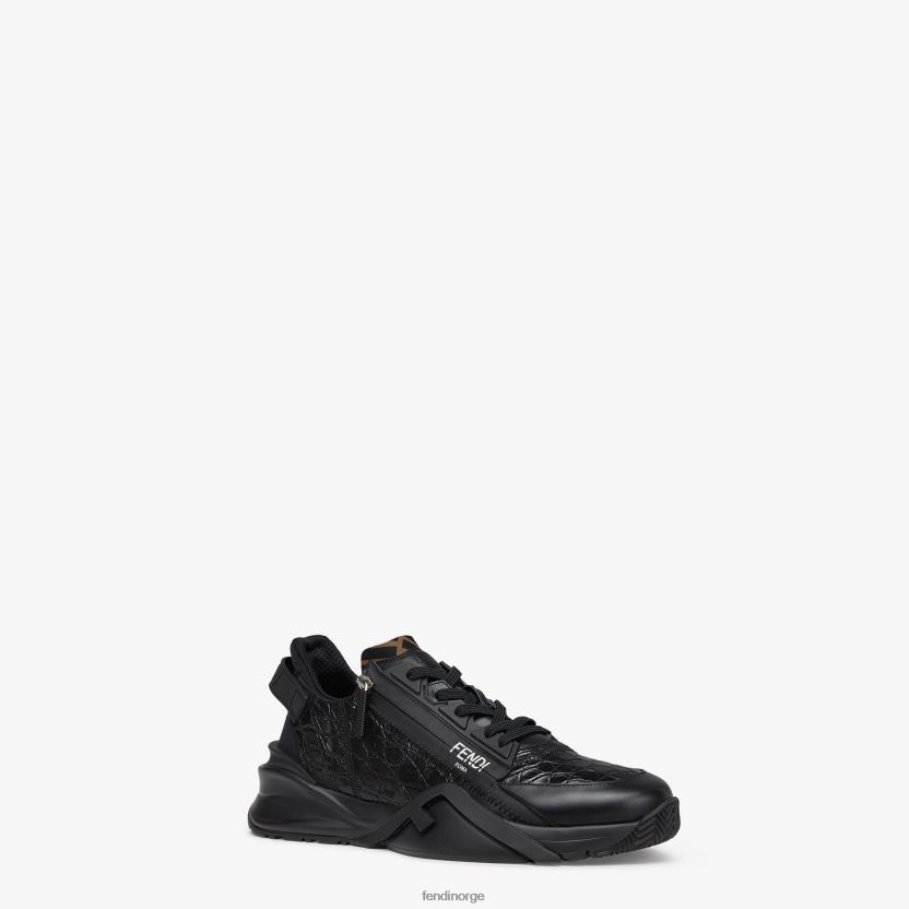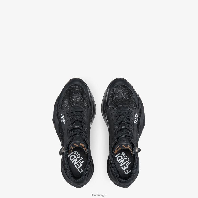 slip-on joggesko med justerbare elastiske lisser, sideglidelås og korrugert såle med inngravert f. fendi flow-bokstaver preget på hælene. laget av svart kaimanskinn. pyntet med en lycra-tunge med ff-motiv. såle i lett hvit gummi med svart diagonal f detalj.