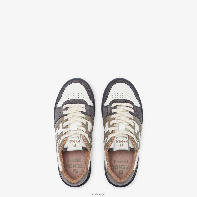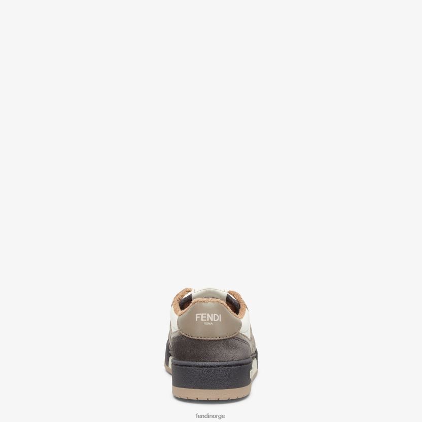 fendi match sneakers med snøre. laget av hvitt skinn med duegrå detaljer og brune semskede innlegg. gummisåle med fendi-skrift på siden.