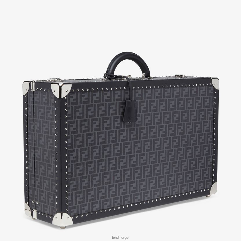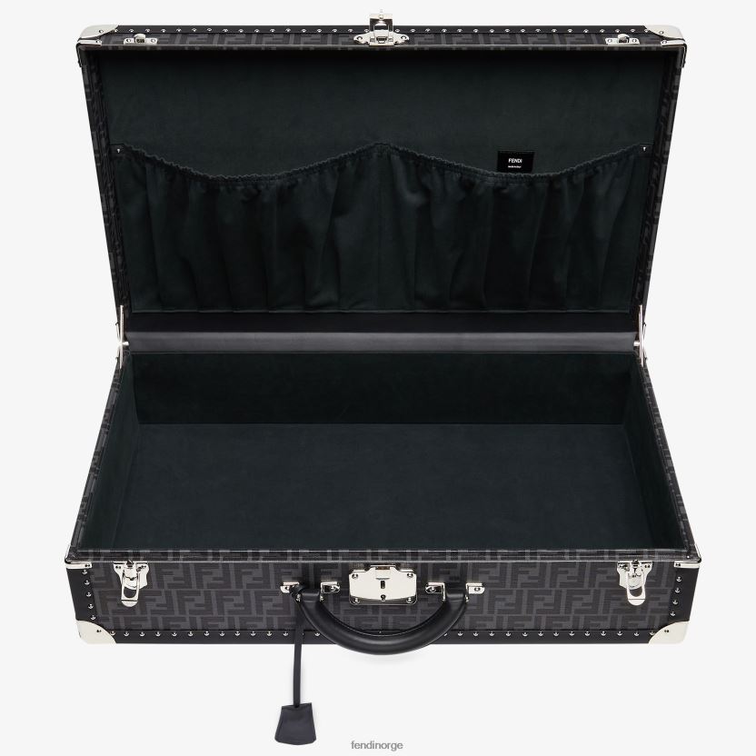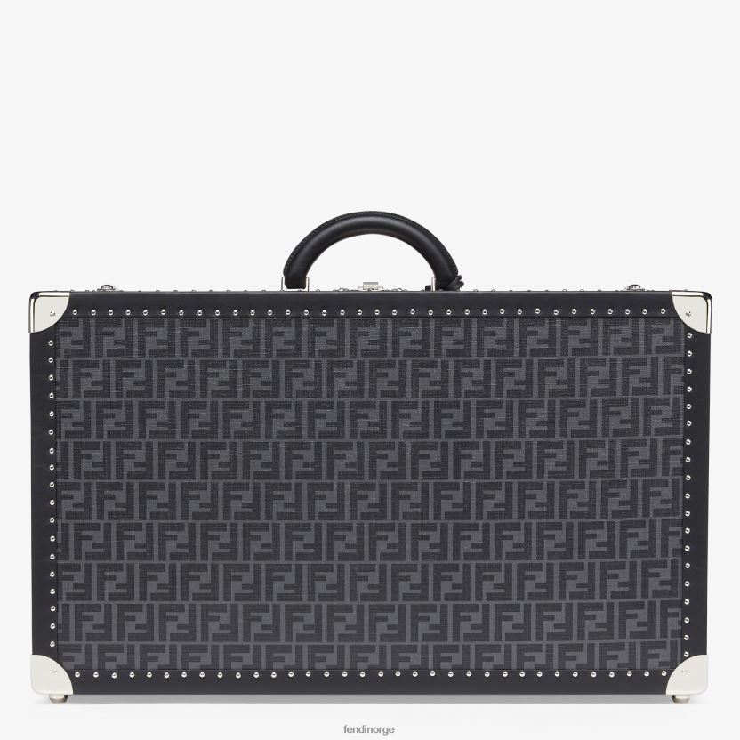 stor versjon av den rektangulære reisebagasjen med trykk- og hengelås dobbel lukking. enkelthåndtak med nøkkelringbrikke og justerbar, avtagbar skulderstropp. stort innvendig rom med to avislommer. laget av stoff med ff-motiv i svart og grått. svarte skinndetaljer. metallvare med palladium-finish.