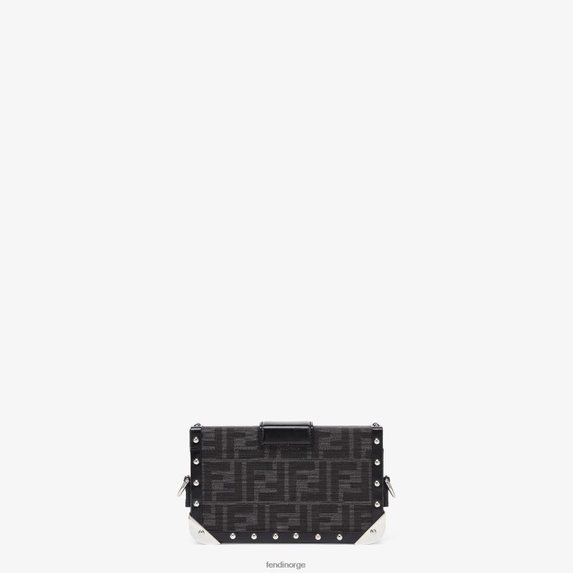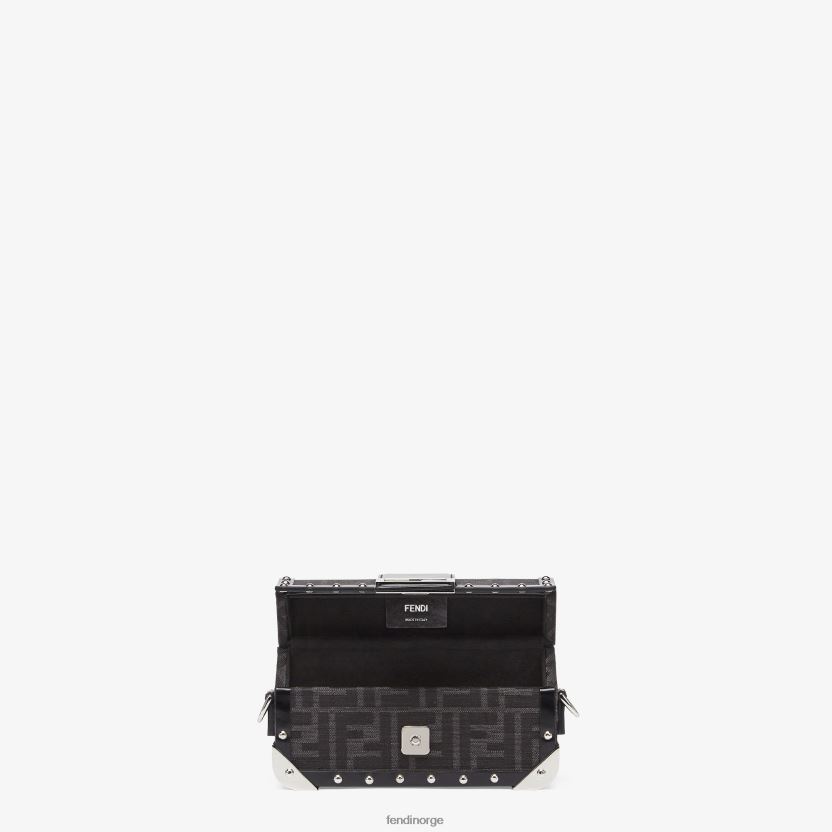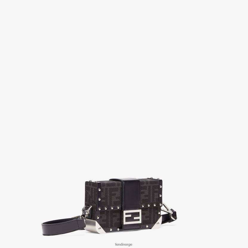 stiv baguetteveske laget av jacquardstoff med sort og grått ff-motiv. firkantet klaff og magnetisk ff-lås. pyntet med metallnagler og svarte skinndetaljer.