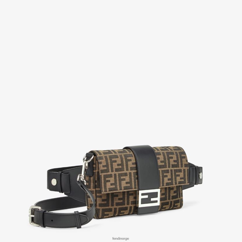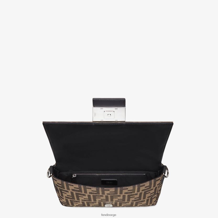 vanlig baguette med firkantet klaff og ff magnetlås. den kan brukes enten som belteveske, ved hjelp av stroppen som trekkes ut av ytterlommen på baksiden, eller som skulder- eller crossbodyveske ved å feste de avtakbare skulderstroppene. fôr med glidelåslomme. laget med brunt stoff. ferdig med all over jacquard ff motiv. metallvare med palladium-finish.