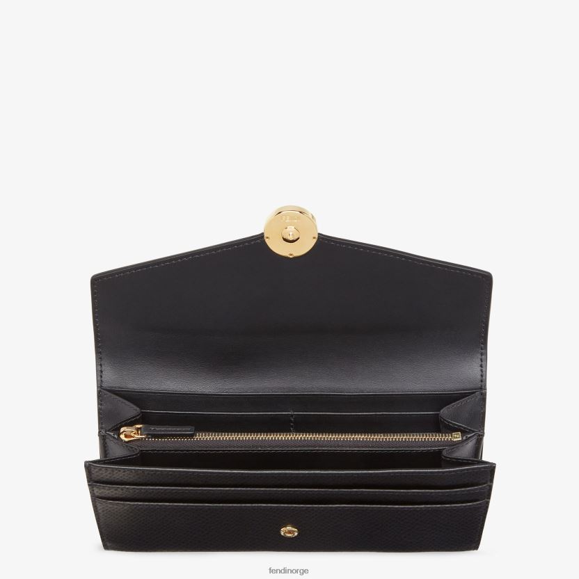 f er fendi kontinental lommebok med trykknappfeste. romslig og velorganisert, med to kilelommer, en glidelåslomme, ti kortspor og flate sidelommer. laget av svart kalveskinn. klaffen er dekorert med den nye fendi-logoen. metallvarer med gullfinish.