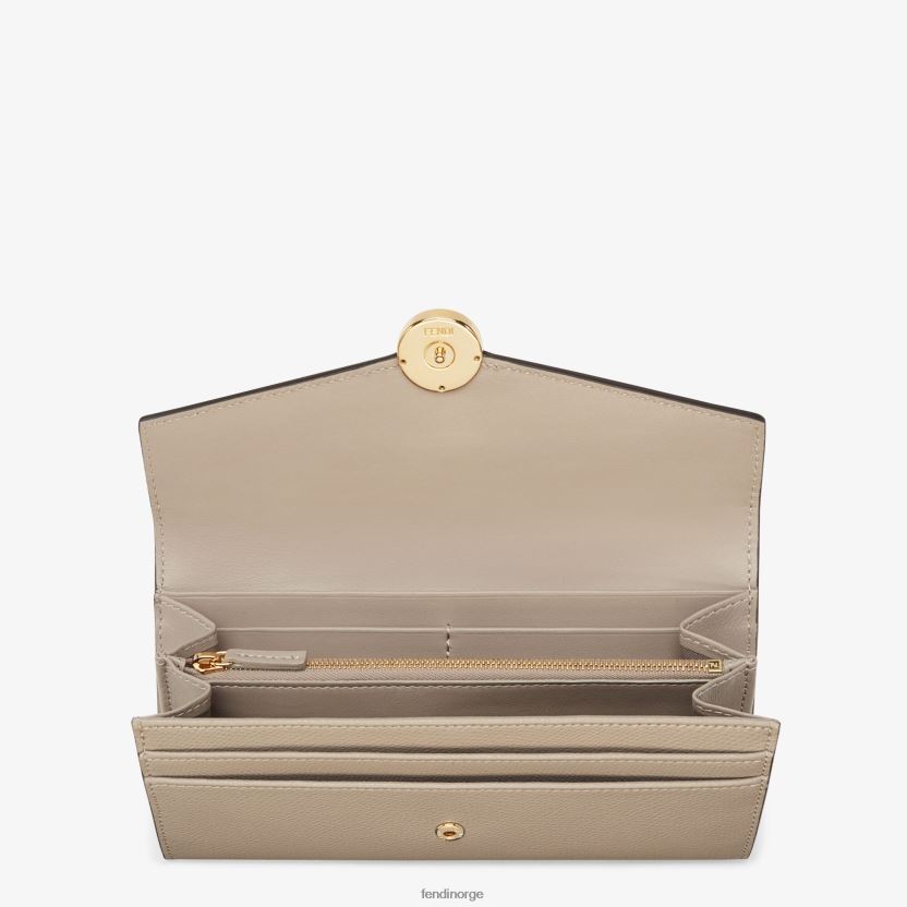 continental f er fendi lommebok med trykknappfeste. romslig og velorganisert, med to kilelommer, en glidelåslomme, 10 kortspor og flate sidelommer. laget i beige strukturert cruiseskinn. metallvarer med gullfinish.