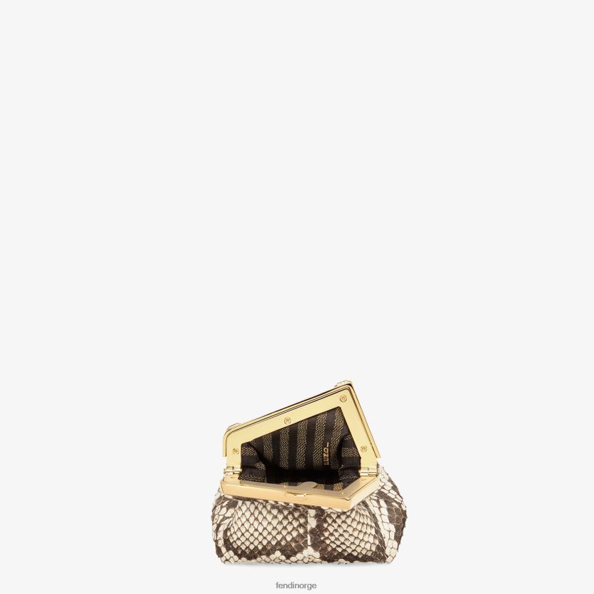 fendi first nano bag, med diagonal ff lås og klips bak som gjør at den kan festes til større vesker eller belter som en sjarm. den kan også brukes på kryss og tvers takket være den fine kjedejusterbare skulderremmen. det er den perfekte formen for å holde airpods eller airpods pro trådløse ørepropper. laget av brunt pyton-trykk elaphe. metallvarer med gullfinish.