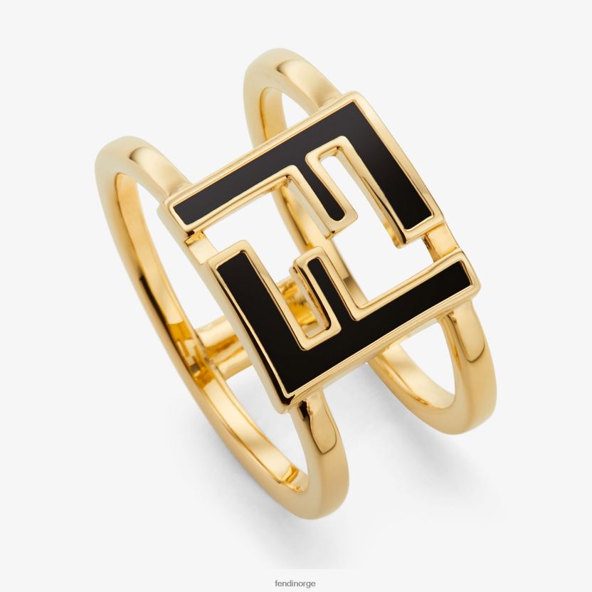 bredbåndsring med to slanke sirkler, også brukbar som en foulard feste. laget av metall med gullfinish. dekorert med ff-motiv emaljert i svart.