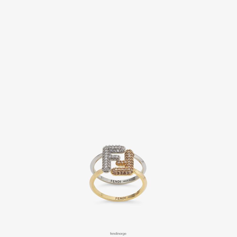 ringer med ff detalj. laget av metall med gull og palladium finish. dekorert med naturlige og champagnefargede krystaller.