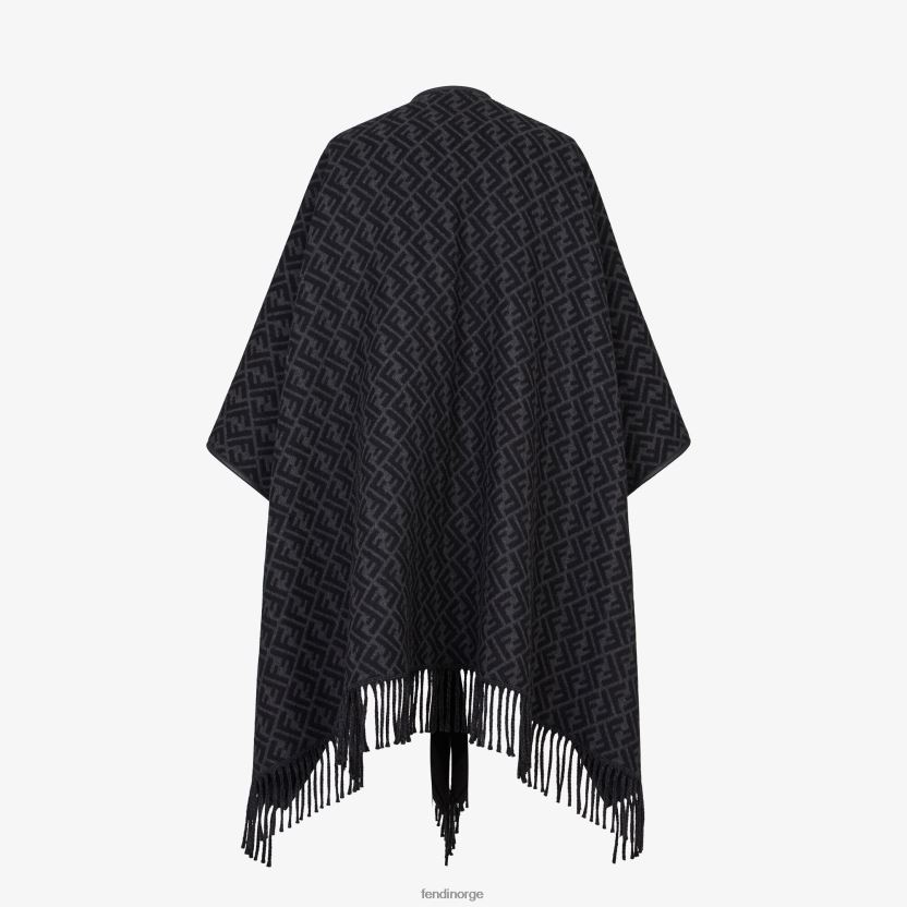 vendbar poncho med frynser på falden. laget av svart og grå kashmir og ull. den ene siden er ferdig med et ff-motiv og den andre med et pequinmønster. svarte skinnkanter.