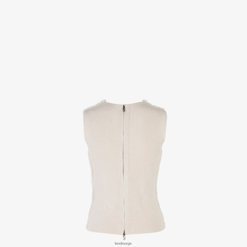 ermeløs tettsittende topp. laget av hvit mink. det håndverksmessige laget med organzabånd og teknisk garn gjør den naturlig myk og elastisk. usynlig glidelåslukking på baksiden med fendi o'lock dobbel skyveknapp.