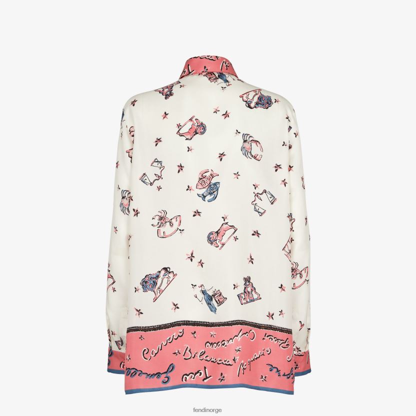 lang skjorte med skjulte knapper. ermene har brede mansjetter og mansjettknapper. laget av silke twill med all-over fendi astrologitrykk i hvitt og rosa.