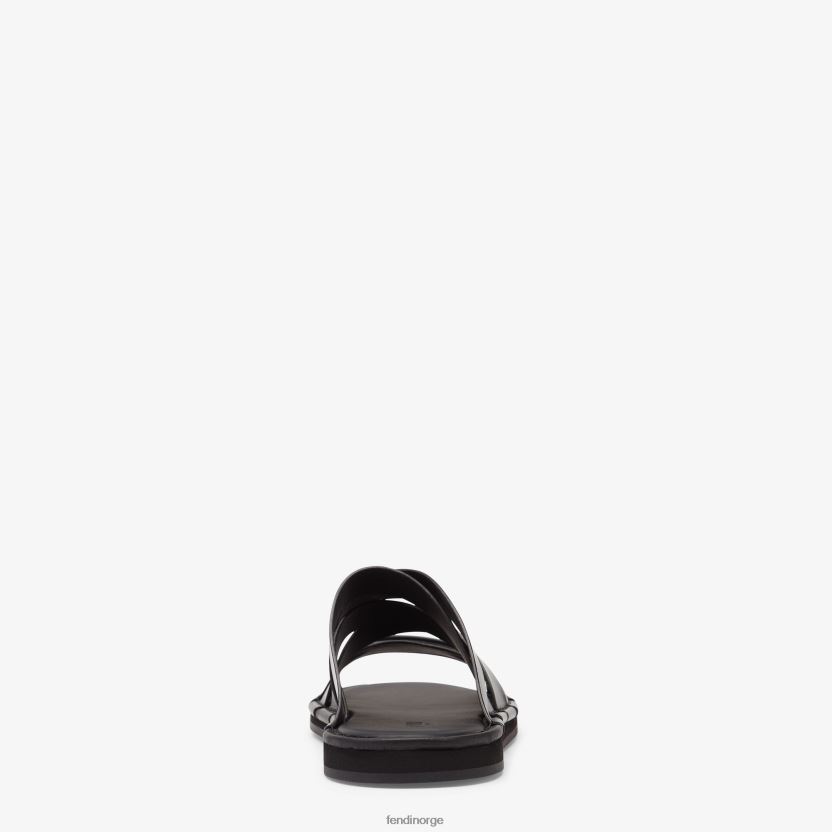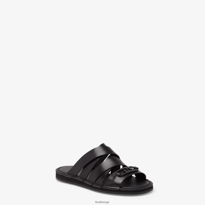 sorte skinner i skinn med kryssede bånd. pyntet med fendi o'lock-motivet i svart emaljert metall.