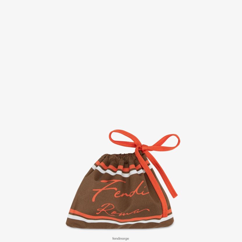 badedrakt med rett hals og dobbel skulderstropp. laget av brun lycra med kontrasterende fendi-astrologitrykk. trimmet med dobbel piping på kantene i oransje og hvitt. matchende veske med snøring og fendi roma-logo.