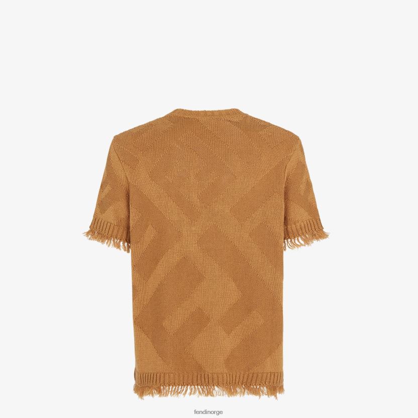 kortermet genser med rund hals. laget av brunt bomullsgarn, med diagonalt oversized ff-motiv intarsia over det hele. ferdig med frynsete kanter ved mansjetten og plaggkanten.