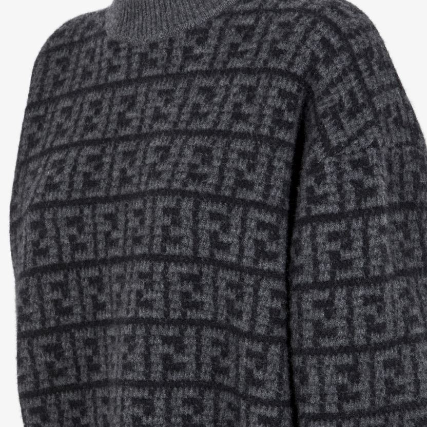 genser med rund hals og lavt utskåren innsett erme. laget av kashmir med heklet ff-motiv i grått og svart. trimmet med ribbestrikket krage, mansjetter og fald.