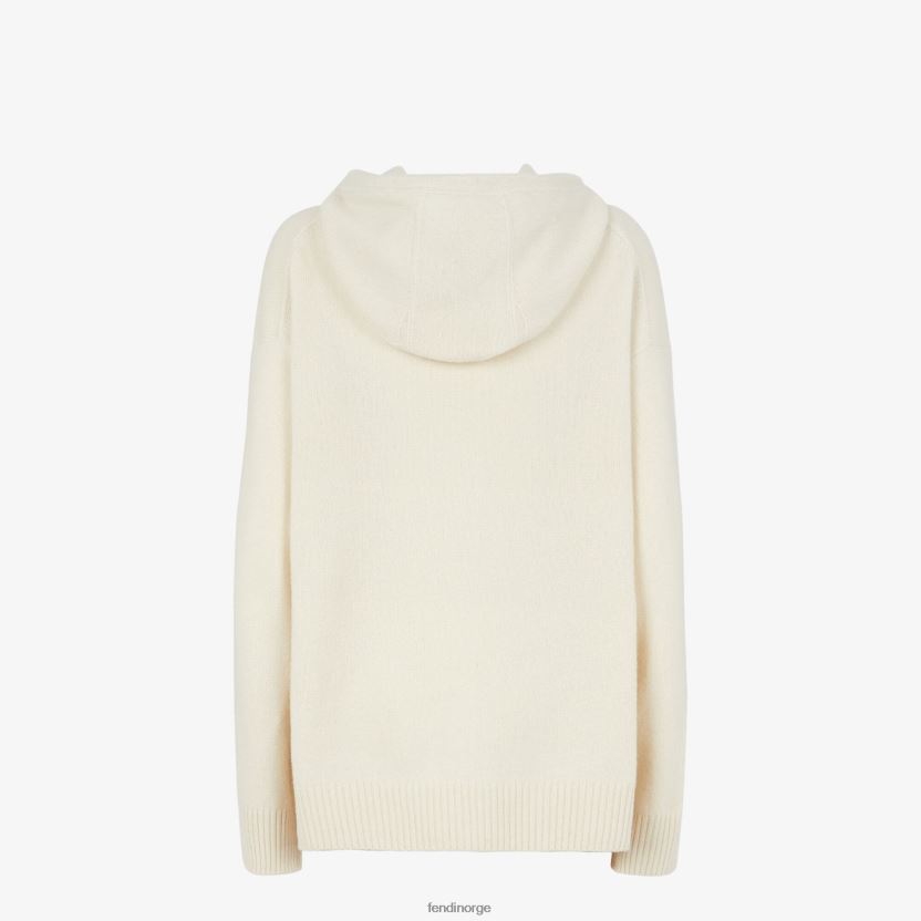 oversized genser med hette med snøring og lave innsatte ermer. laget av hvit øko kashmir. merket med preget ff-detalj på brystet.
